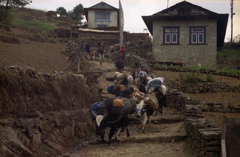 トレッカ−やポ−タ−,ヤクが煩雑に行き交う。
