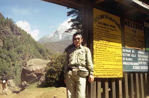 モンジョのサガルマータ国立公園出先事務所でトレッキング・パーミットのチェックを受けるが、分厚い手書きの台帳のページを繰って該当を見つけて照合する。