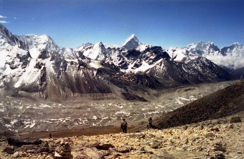 南側のいま登ってきた方を振り返るとク−ンブ氷河が広大に横たわっていて、その彼方にアマ・ダブラムやカンテガ,タムセルクなどのク−ンブ山群の山々が見渡せる。