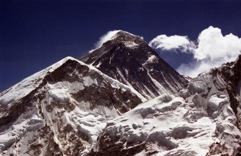 東側にはトレッキング最大の目的であった世界最高峰の山エベレストが、BCから立ち上がる前鋭峰とすぐ眼の前に迫るヌプツェの間の向こうにサウス・コルから三角形に盛り上がっている。