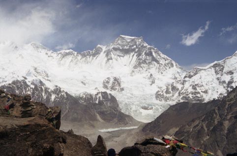 ゴジュンバ氷河の最奥から立ち上がる氷雪の岩壁のギャチュン・カンは圧巻で、左にゴジュンバ・カン2峰(7646m),1峰(7743m)、そしてチョー・オユーと続く眺めは正しくヒマラヤそのものだ。